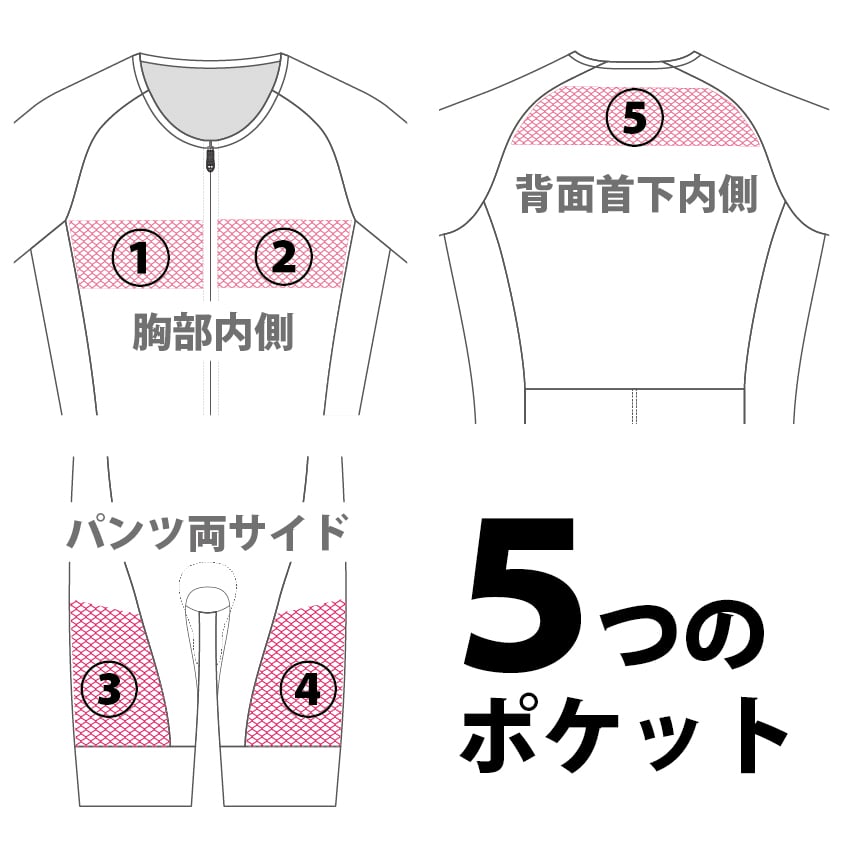 生地素材:メッシュトップスの身頃には通気性と速乾性の高いメッシュ素材を採用し、袖と脇部分には伸縮性の高い、撥水加工を施したメッシュ素材を採用。酷暑期のレースに涼しさを求めるトライアスリートに最適な一着
