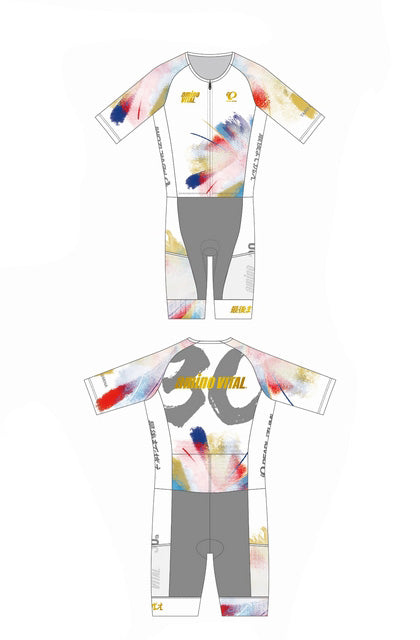 生地素材:メッシュトップスの身頃には通気性と速乾性の高いメッシュ素材を採用し、袖と脇部分には伸縮性の高い、撥水加工を施したメッシュ素材を採用。酷暑期のレースに涼しさを求めるトライアスリートに最適な一着